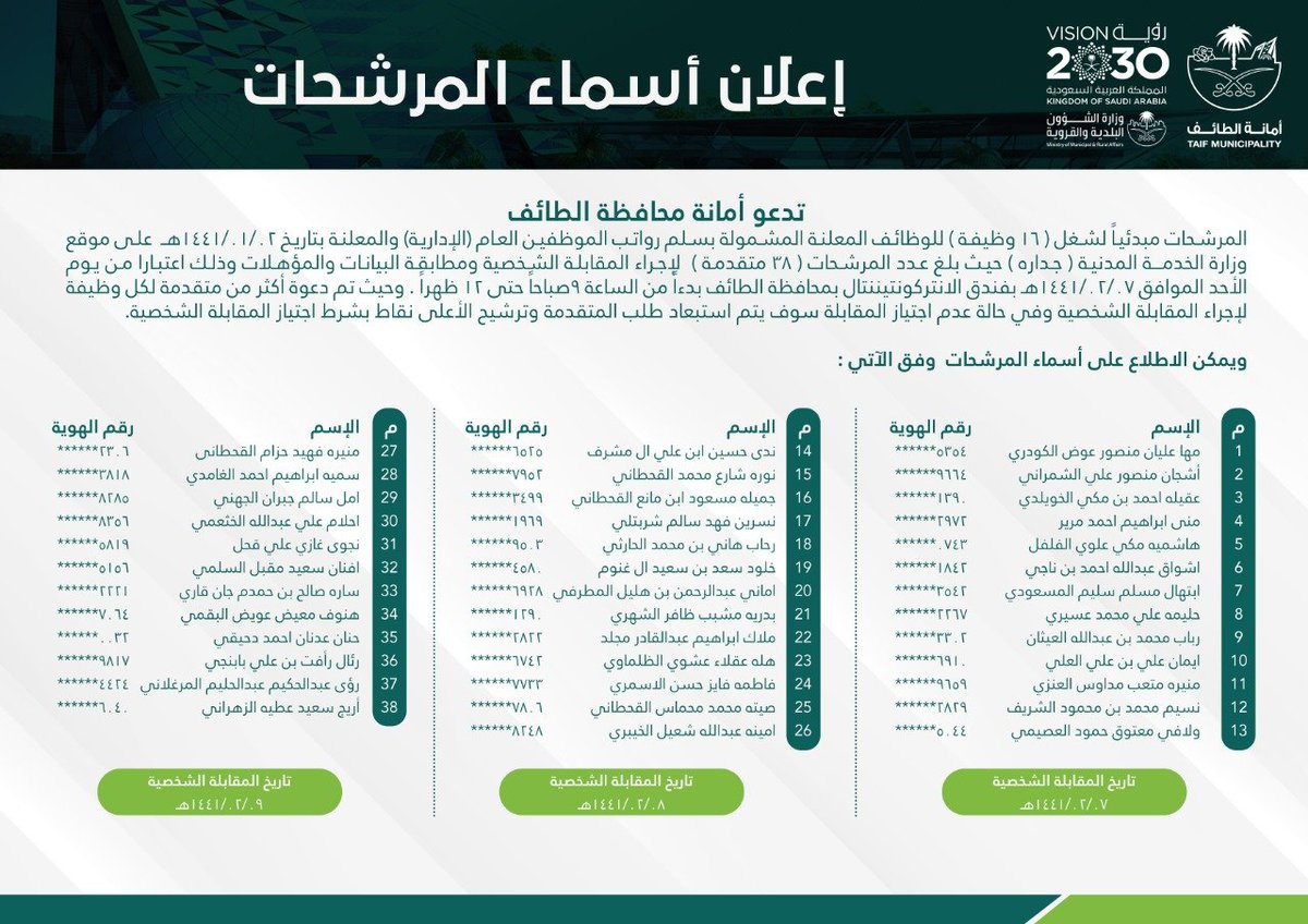 وظائف > أمانة محافظة الطائف تعلن أسماء 28 مرشحة مبدئياً للوظائف الإدارية